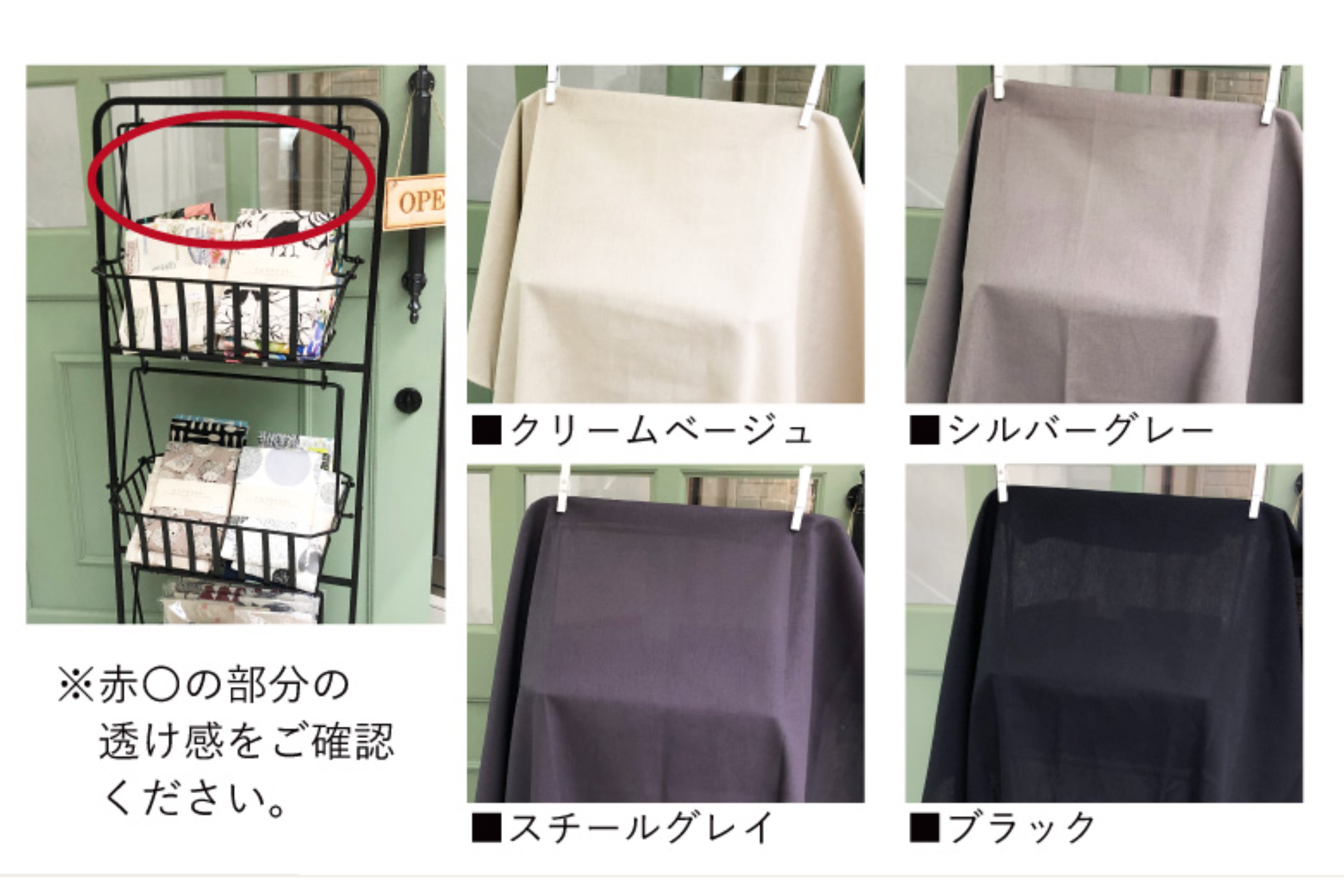 同じ生地でも、お色により透け感が違います。黒に近くなるほど、光を反射せず吸収するため透け感が増します。