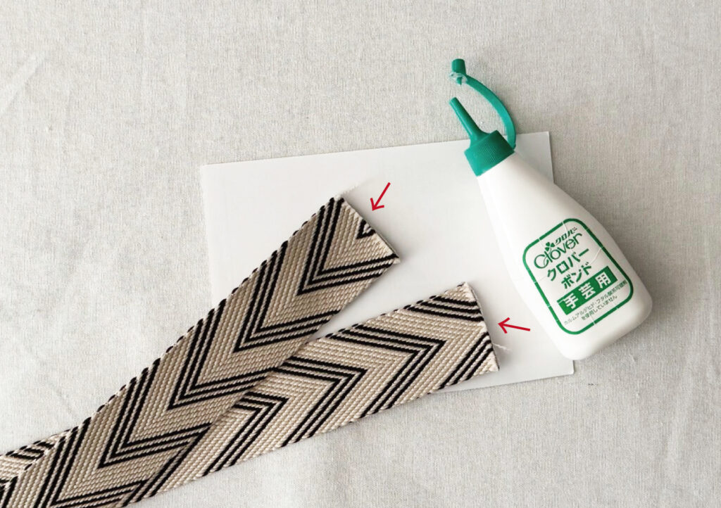 赤の→の部分、テープの端が切りっぱなしのままだとほつれてくるので、余分な糸などをカットし、手芸用ボンドを塗ります。