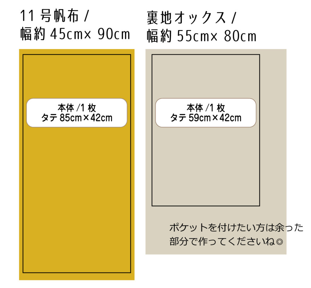 図のように表布(11号帆布)と、裏地(オックス)を裁断します。