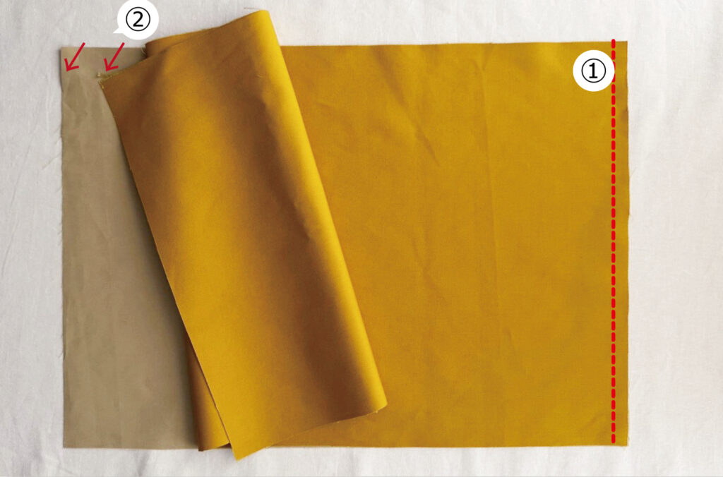 ①を縫い合わせ、②の→部分を合わせて②の部分も縫い代1cmで縫い合わせます。