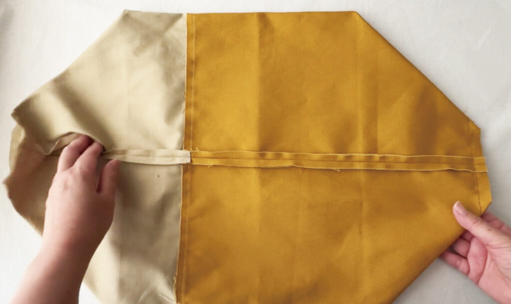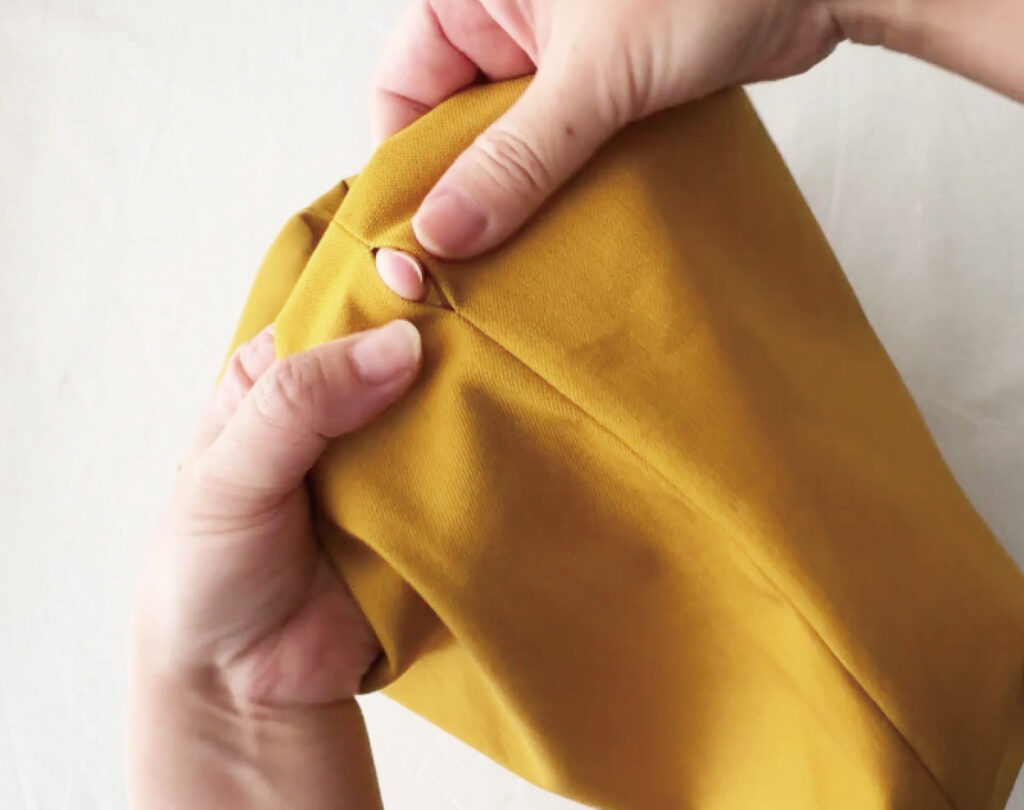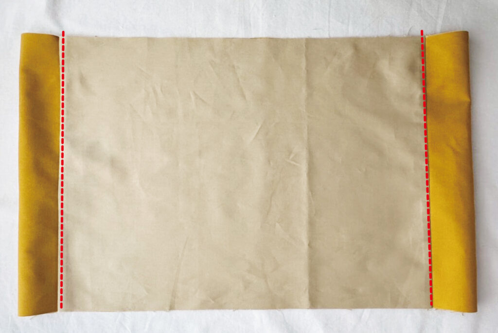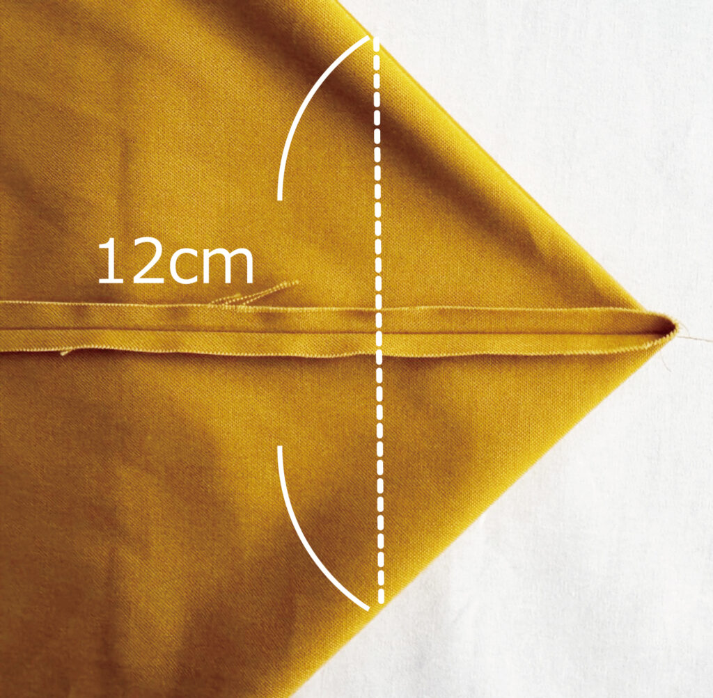 角をつまんで三角に畳み、マチが12cmになるように線を引き、縫います。