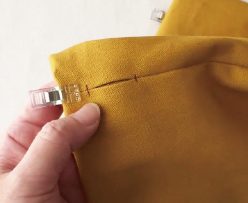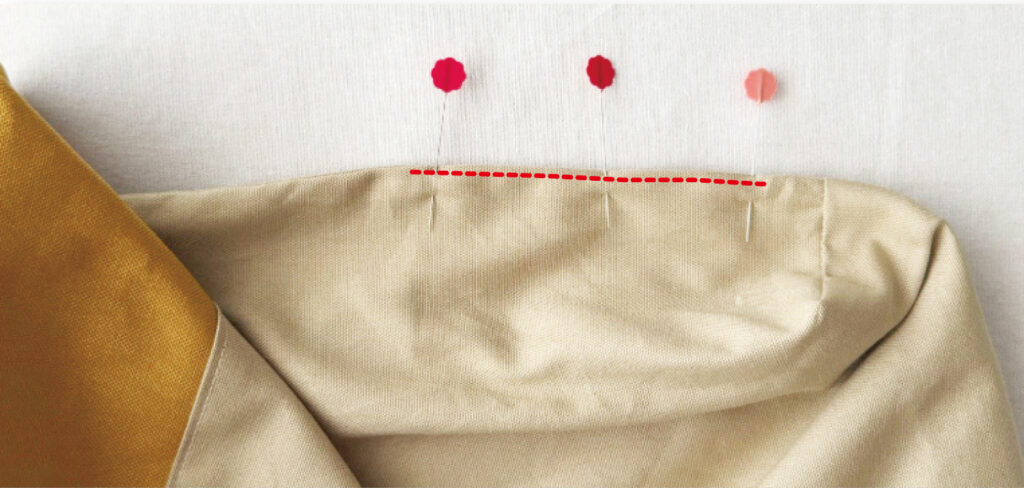 中表で2枚を合わせて待ち針でとめ、縫い代1cmで縫い合わせます。