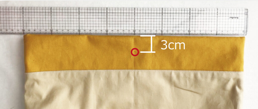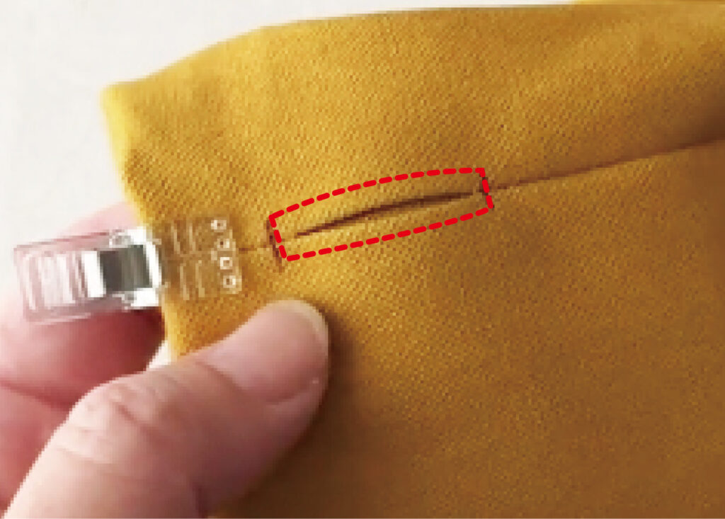 表側と内側の持ち手テープ通し口を同じ位置に合わせます。